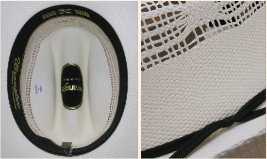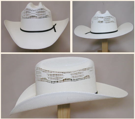 ラングラー社の夏に最適なカウボーイストローハットです。 カラーはホワイト系のナチュラルカラーです。 フェイクストローのペーパーストローハットで型押しで作られたハットです。 ハッバンドはリボンタイプです。 つばの角度調整はできません。 オバールはやや丸みのあるラウンドタイプです。