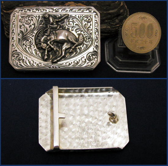 小さな小振りのトロフィーバックルで、中央部分に荒々しい馬に跨るサドルブロンコのモチーフが素敵なバックルです。